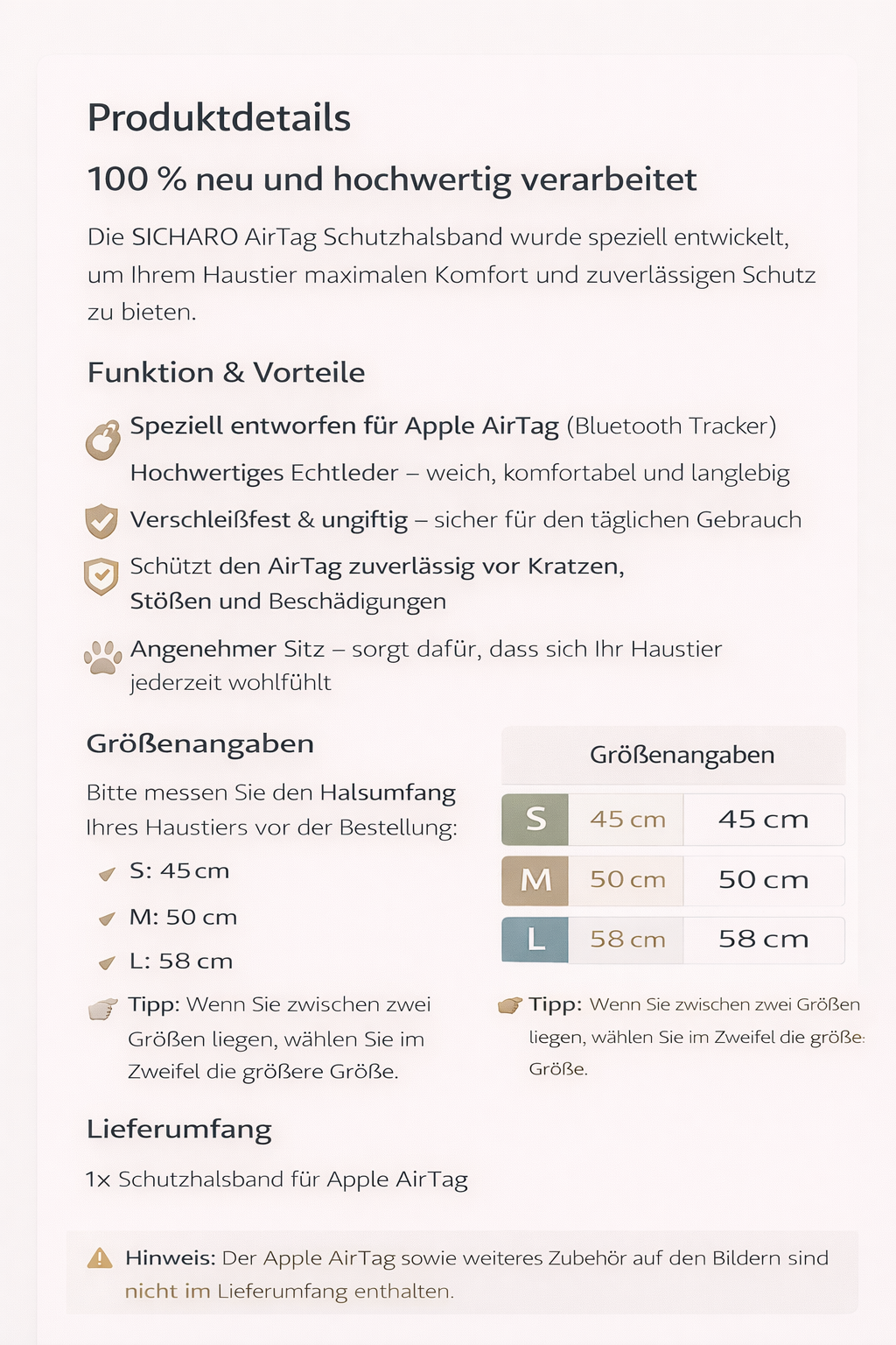 Für ein optisch und funktional abgestimmtes Set empfehlen wir die Kombination mit dem passenden SICHARO AirTag Halsband.